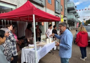 Manden med hunden, der sagde, han er nabo til kirken og præsteboligen. Det, hans hustru havde set, var: Først gik der to damer, der bar på fade med kager, og bagefter kom så præsten også! Hvad mon de skulle? – Det kunne han så se med egne øjne! Vi snakkede med ham, han skulle lige købe ind, men ville komme igen. Han fik pakket dejlig kringle i servietter. Kringlen og den gode historie kunne han så tage med hjem, selvfølgelig med en invitation til de kommende dages Åben Hus tilbud i kirken – oplagt, når de nu er naboer!